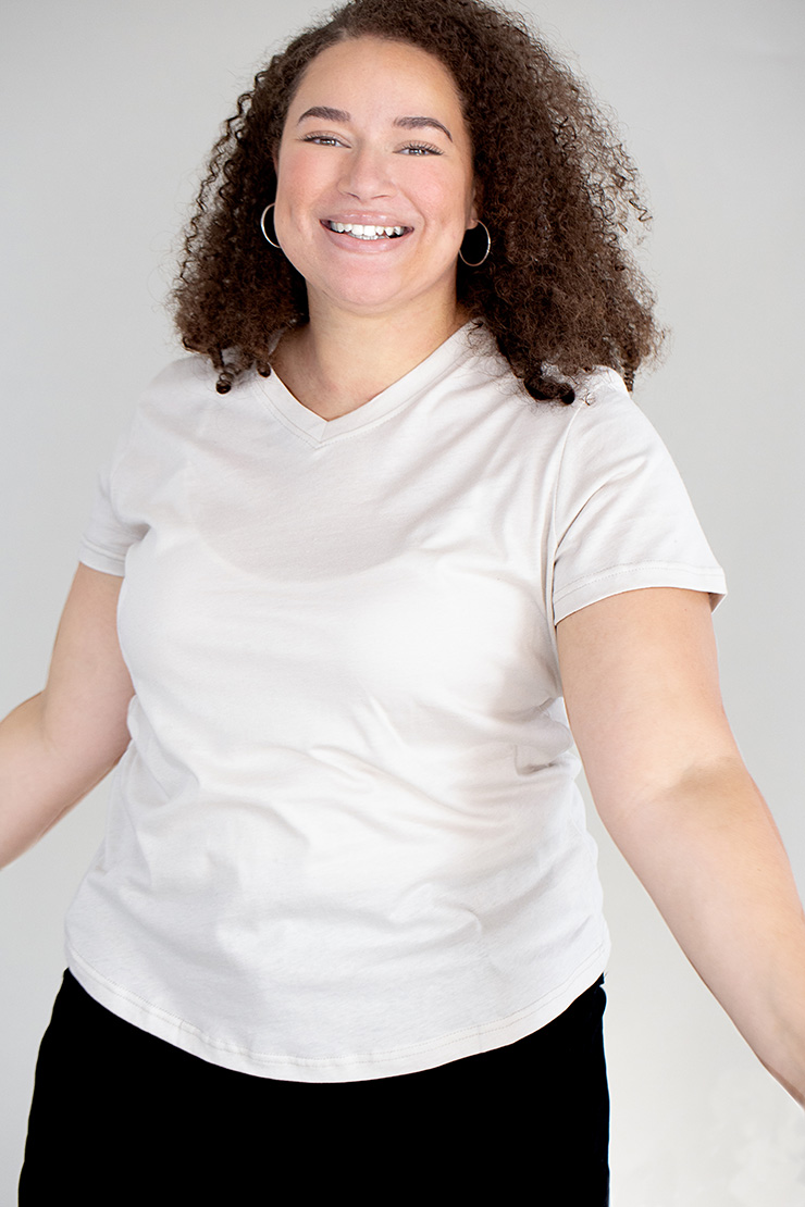 A fit tailored for women with a subtle V-neck, designed with extra room for the bust and larger hips.